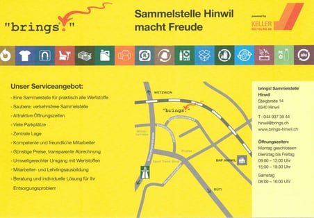 In der Gemeinde Bubikon ist am Freitag ein Werbeflyer für die "brings!"-Abfallsammelstelle in Hinwil verteilt worden. "brings!" ist ein Verbund von regionalen Recyclern mit rund zehn Standorten in der Schweiz. Das Angebot konkurrenziert die "Mobile Sammelstelle", die die Oetwiler Firma J. Grimm für Bubikon und Dürnten betreibt.