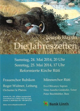 Der Frauenchor Bubikon und der Männerchor Rüti bringen am Samstag, 24. Mai 2014 (20 Uhr) und am Sonntag, 25. Mai 2014 (17 Uhr) in der reformierten Kirche Rüti das Oratorium "Die Jahreszeiten" von Joseph Haydn zur Aufführung. Es war das letzte grosse Werk des Komponisten und wurde am 24. Mai 1801 in Wien uraufgeführt. Das Konzert steht unter der Leitung von Roger Widmer. Unterstützt werden die Chöre vom Orchester le Phénix und den Solisten Eva Oltivanyi (Sopran), Nino Aurelio Gmünder (Tenor) und Peter Brechbühler (Bass).