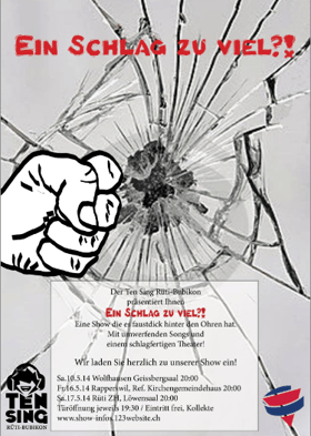 "In Schlag zuviel?!" – So heisst das neue Programm, mit dem der Ten Sing Rüti-Bubikon im Mai auf "Tournee" in der Region geht. Die Story des Stücks beleuchtet die zu allerhand Tumulten führende Konstellation verschiedener Charaktere in einer Sek-Klasse. Aufführungen sind geplant in Wolfhausen (10. Mai, Geissbergsaal, 20.00 Uhr), Rapperswil (16. Mai, Ref. Kirchgemeindehaus, 20.00 Uhr) und Rüti (17. Mai, Löwensaal, 20.00 Uhr). Der Eintritt ist frei, es wird eine Kollekte erhoben.