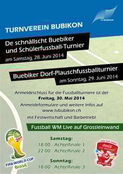 Am Bubiker Grümpi-Wochenende vom 28./29. Juni 2014 können die WW-Fussballspiele auf dem Festplatz live auf einer Grossleinwand mitverfolgt werden. Am Samstag werden die beiden Achtelfinalspiele um 18.00 und um 22.00 Uhr übertragen, am Sonntag das dritte Achtelfinalspiel um 18.00 Uhr. Die Anmeldefrist für Schüler- und Plauschmannschaften läuft noch bis zum 30. Mai 2014.