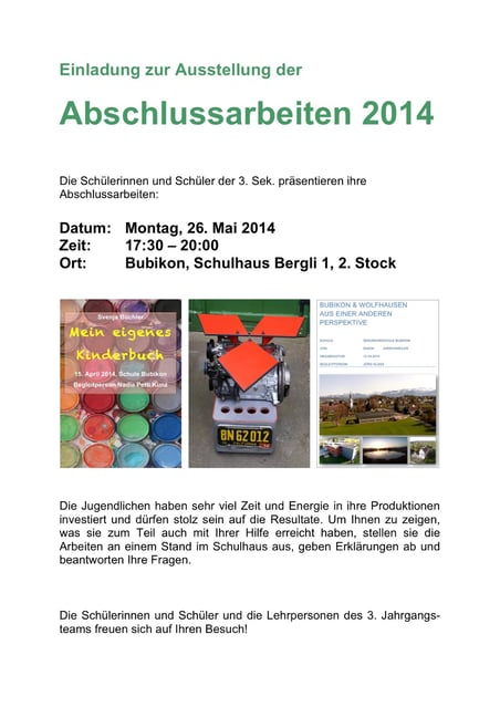 selbstgewähltes Projekt durchgeführt. Das Ergebnis wird am 26.mai 2014, zwischen 17:30 und 20:00 Uhr im Schulhaus Bergli präsentiert. Die Schule freut sich über möglichst viele Besucher aus