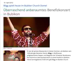 Es war eines der Highlights in der Geschichte von «buebikernews»: Die Meldung über ein überraschend anberaumtes Benefizkonzert des Rappers «Bligg» im «Church Dome» in Bubikon schlug am 1. April 2012 ein wie eine Bombe. «Bligg», der in seiner Jugend einige Jahre in Wolfhausen gelebt hatte, war ja der grosse Abwesende an der 1200-Jahr-Feier im Sommer 2011 gewesen. Angeblich seien seine Honorforderungen zu hochgewesen, weshalb man dann schliesslich Baschi und Adrian Stern für die Party engagiert hatte. «Bliggs» Absage hatte dem Musiker im Dorf nicht unbedingt Sympathien eingetragen...und, geplagt von Gewissensbissen, habe er sich darum zu einem Benefiz-Konzert entschlossen, berichtete «buebikernews» damals.