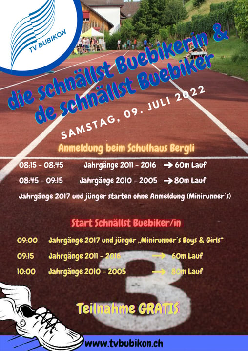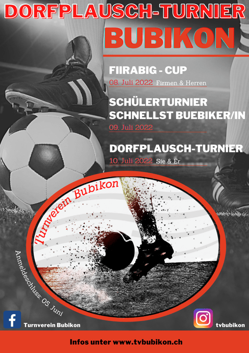 Am Freitag, 8. Juli wird zunächst im «Fiirabig-Cup» für Herren- und Firmenmannschaft Fussball gespielt. Am Samstagmorgen misst sich dann die Schuljugend im traditionellen Leichtathletik-Wettbewerb «di schnällst Buebikerin & de schnällst Buebiker», bevor es dann am Nachmittag mit dem traditionellen Jugend-Fussballgrümpi weitergeht. Das Dorfplausch-Turnier für Erwachsene mit Sie&Er-Mannschaften bildet am Sonntag, 10. Juli den Abschluss des festlichen Grossanlasses.