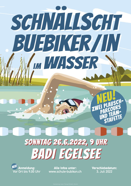 Am Sonntag, 26. Juni 2022, findet in der Badi Egelsee ab 9.00 Uhr der traditionelle Wettkampf «De/Di schnällscht Buebiker/in im Wasser» statt. Gestartet wird wie immer in verschiedenen Alters- und Distanzkategorien. Neu können auch die Kleinsten (Jahrgänge 2017 und 2018) in einem Hindernisparcours mitmachen. Neu ist ebenfalls eine Zweierstafette (auch gemischt), und neu kann man sich direkt vor Ort anmelden. Sollte das Wetter nicht mitspielen, ist für den 3. Juli 2022 ein Verschiebedatum fixiert (Infos ab heute Freitag, 12. 00 Uhr, auf www.bubikon.ch).