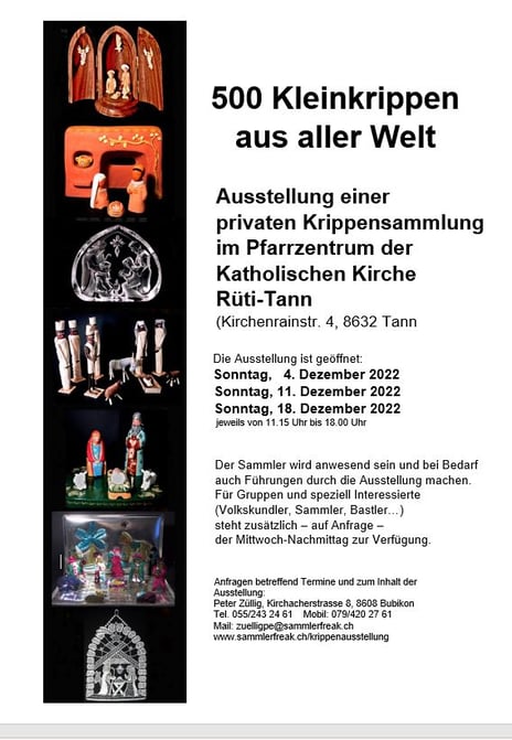 Er heisst Peter Züllig, wohnt in Bubikon und nennt sich selber «Sammlerfreak». Unter dieser Domain ist er auch im Internet zu finden, wo er seine gesammelten Schätze – etwa die umfassende Sammlung über Karl May – präsentiert und seine Sammelleidenschaft erläutert. Züllig sammelt auch Weine, Kugelschreiber und Aktionskataloge. Und Weihnachtskrippen: Teile aus seiner Krippen-Sammlung waren schon verschiedentlich in Bubikon als Adventskalender-Fenster zu sehen. Nun stellt er 500 Kleinkrippen aus aller Welt im Pfarreizentrum der katholischen Kirche Rüti-Dürnten-Bubikon an drei Sonntagen im Advent – 4., 11. und 18. Dezember 2022 – aus.
