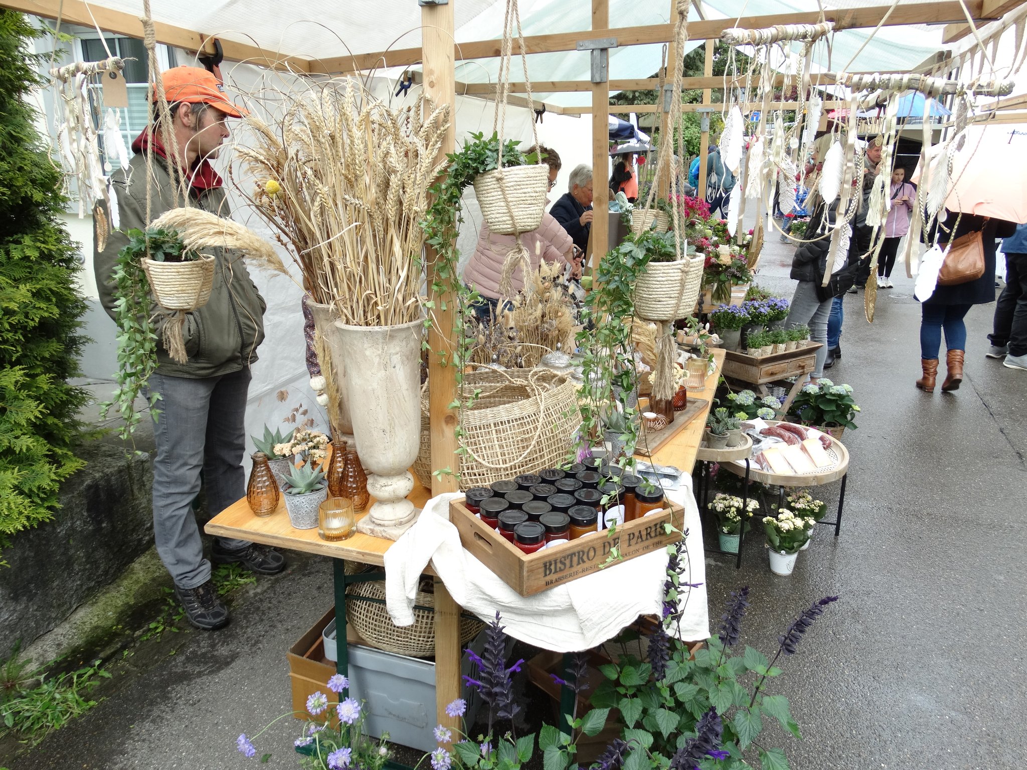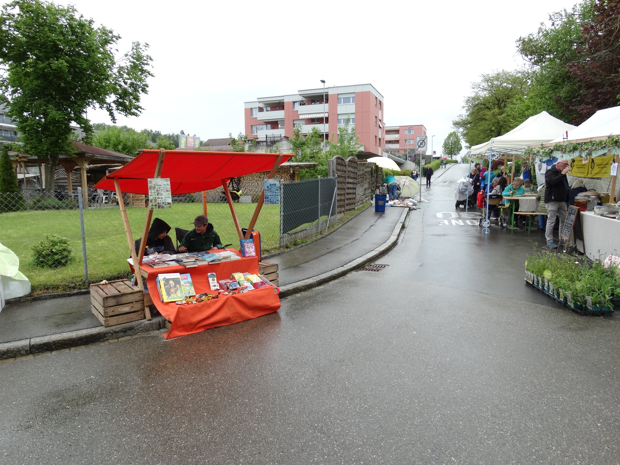 40 Jahre Dorfmärt Wolfhausen – und das Marktwetter blieb der «Tradition» der vergangenen Jahre treu: ein paar trockene Abschnitte, aber auch viel Regen. Das tat der Stimmung am Märt aber keinen Abbruch: überall lachende Gesichter und munteres Treiben, vor allem natürlich rund um die kulinarischen Stände und Beizchen, wo man gut auch Unterschlupf fand vor der Feuchtigkeit. Einzig die Kinder hatten mit ihren Spielzeug-Verkaufsplätzen ein wenig das Nachsehen, war es doch schwierig, die Schätze vor dem Regen zu schützen. Dementsprechend klafften auch Lücken in den Marktreihen.