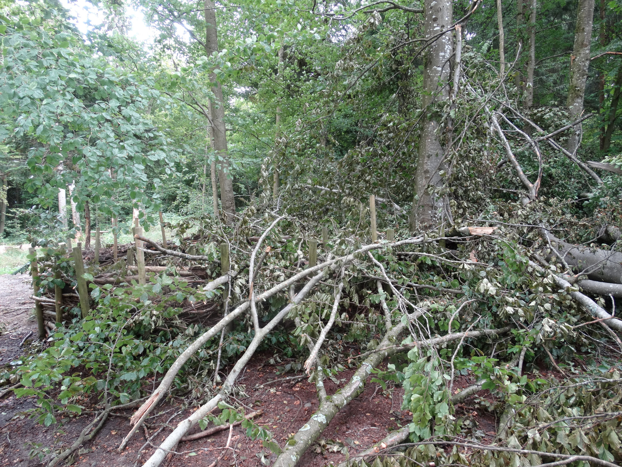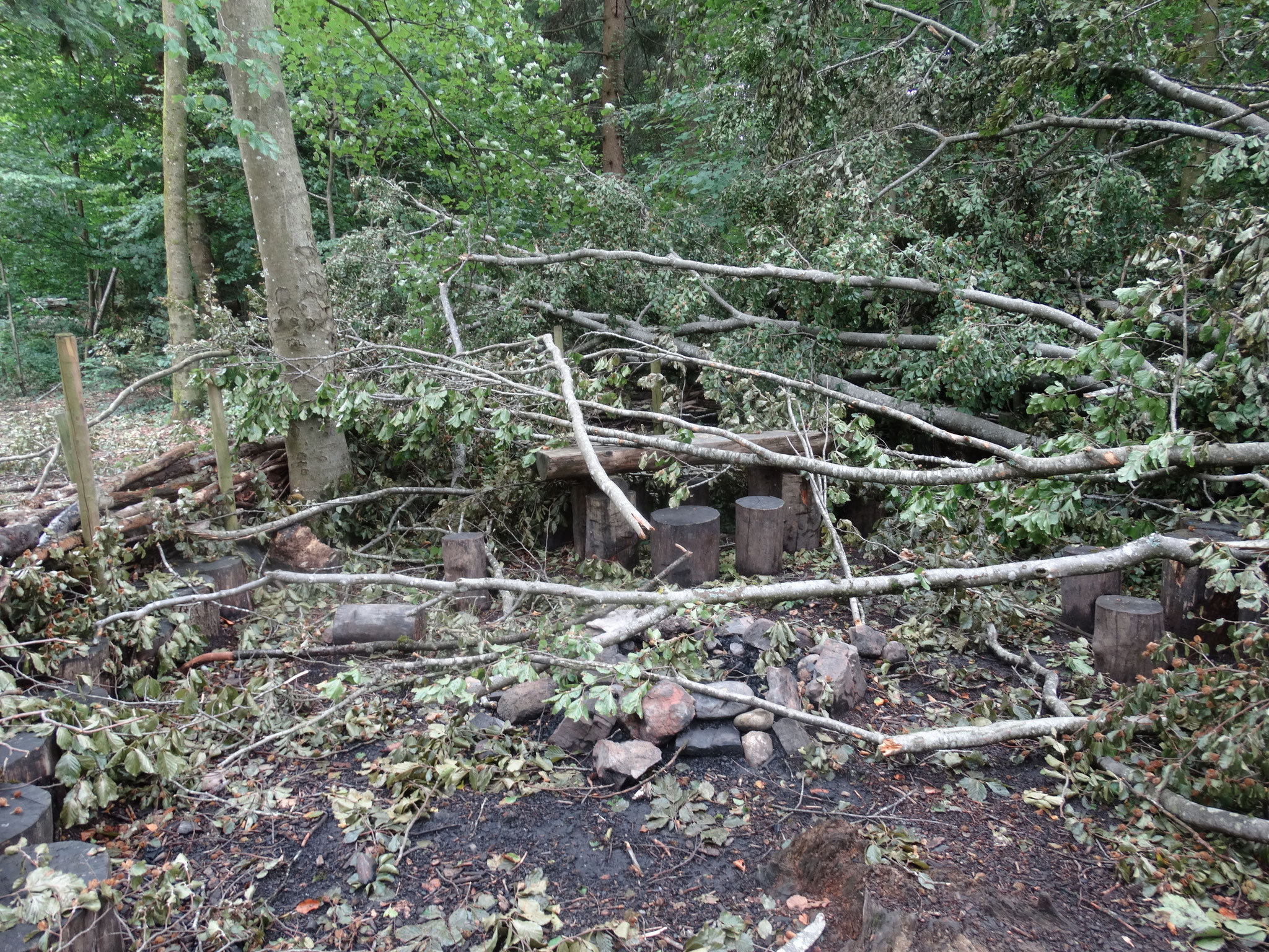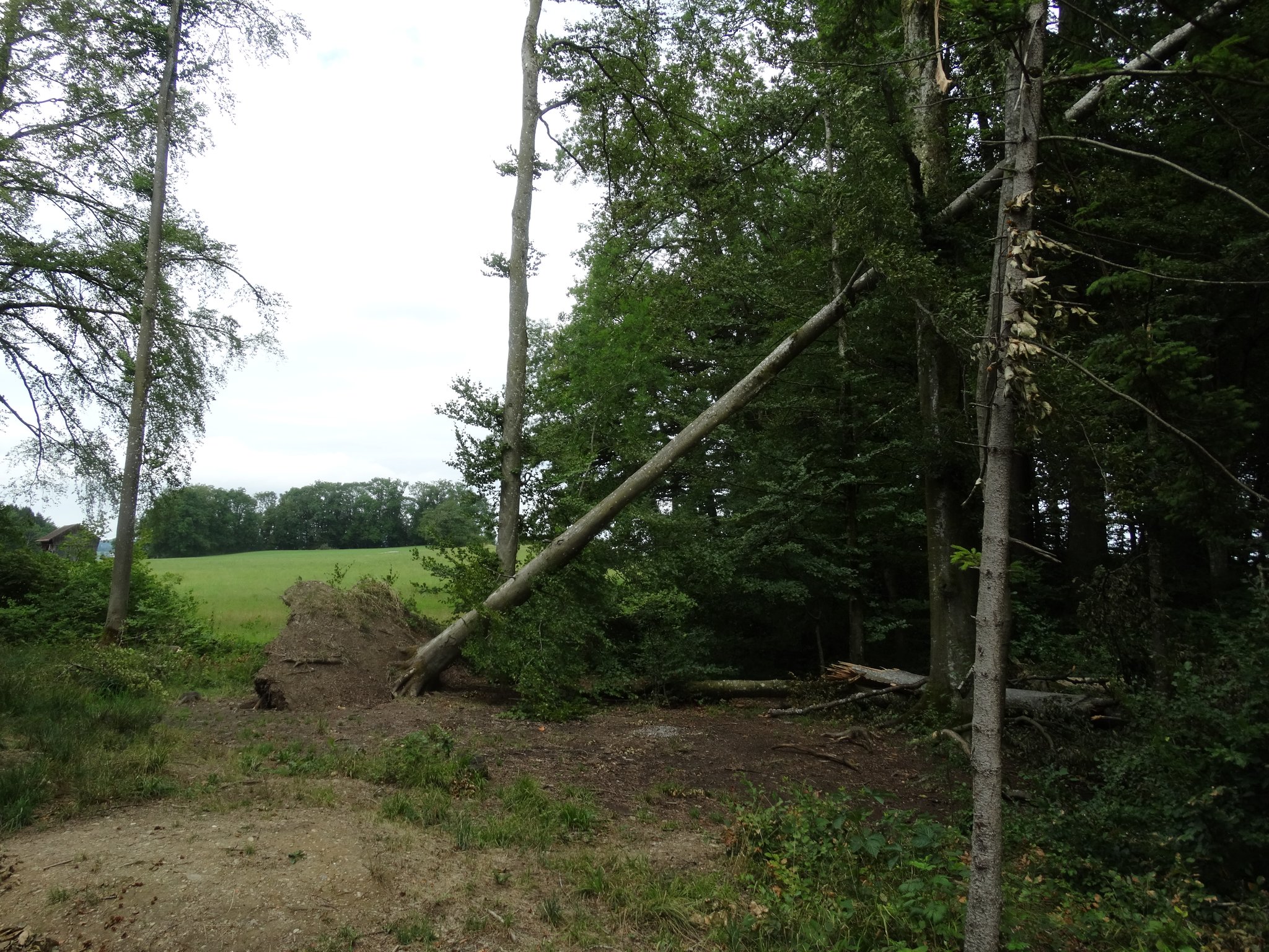 Das beliebte Waldsofa der Wolfhauser Kindergärten im Waldstück «Botzflue» ist beim Gewittersturm vom vergangenen Dienstag (13. Juli 2023) arg in Mitleidenschaft gezogen worden. Rund die Hälfte der aus Ästen gefertigten Anlage, die auch von Familien und Jugendlichen gerne als Feuerstelle benutzt wird, liegt unzugänglich unter einer entwurzelten Buche begraben.