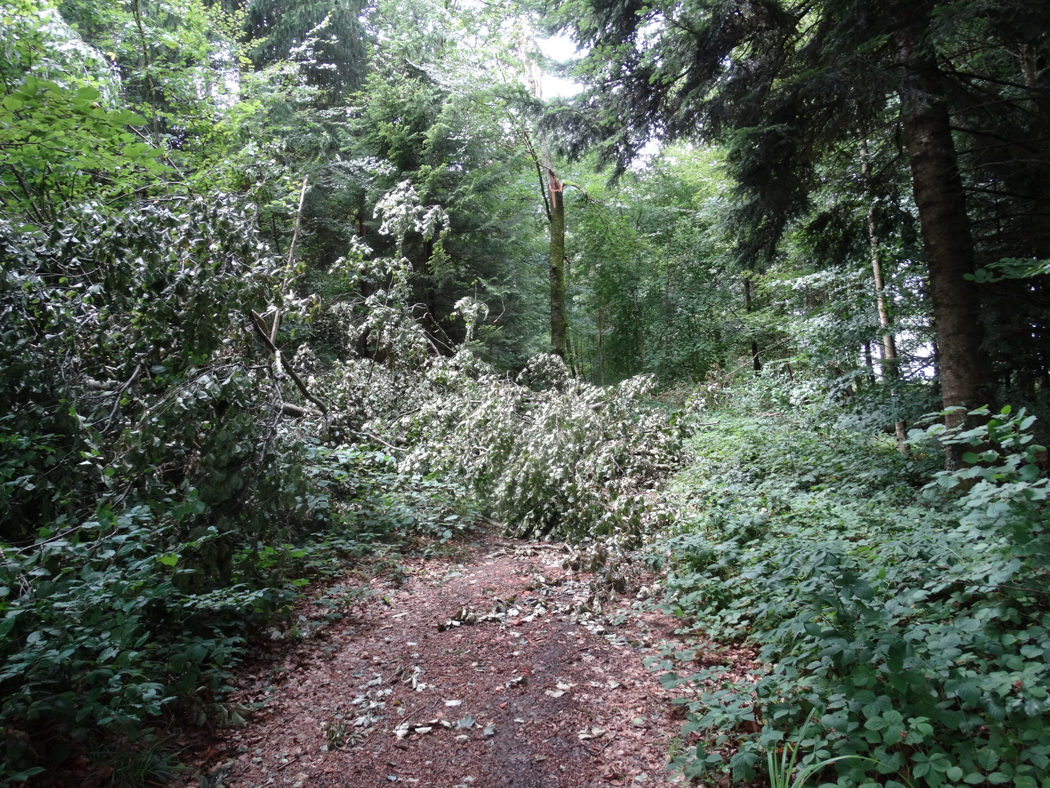 Die Sturmschäden im Wolfhauser Waldgebiet «Weidholz»/«Lochholz»/«Botzflue» sind enorm. Zwar konnten die Waldwege, insbesondere der «Lochholz-Weg», inzwischen mehrheitlich von umgestürzten Bäumen befreit und wieder passierbar gemacht werden. Im Waldesinnneren jedoch ist die zerstörerische Wucht der Orkanböen noch deutlich sichtbar. Das betroffene Waldgebiet ist nicht abgesperrt; da jedoch an manchen Stellen noch abgerissene Äste in den Baumkronen hängen, sind Waldspaziergänge nicht empfehlenswet, vor allem nicht bei windigem Wetter.