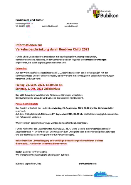 Im Zusammenhang mit der Bubiker Chilbi hat der Gemeinderat über folgende Verkehrsbeschränkungen informiert: