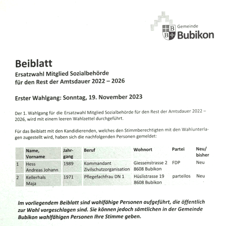 In den meisten Haushaltungen von Bubikon und Wolfhausen sind die Abstimmungsunterlagen für den Urnengang vom 19. Novemeber 2023 am Mittwoch und Donnerstag zugestellt worden. Da nebst der Ständeratswahl (2. Wahlgang) auch einige gewichtige regionale und kommunale Geschäfte zur Entscheidung anstehen, ist die Zeit für das Studium der Weisungen ein wenig knapp bemessen.