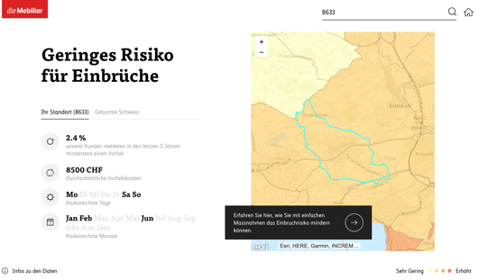 Dämmerungszeit – Einbruchszeit...Die Versicherung Schweizer Mobiliar weiss aufgrund der Auswertung ihrer Kundendossiers, wo und wann das Risiko, von einem Einbruch betroffen zu sein, hoch ist. Mit der Postleitzahl können die Daten online abgerufen werden.