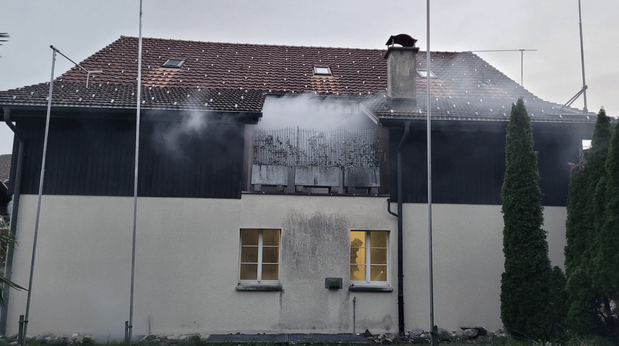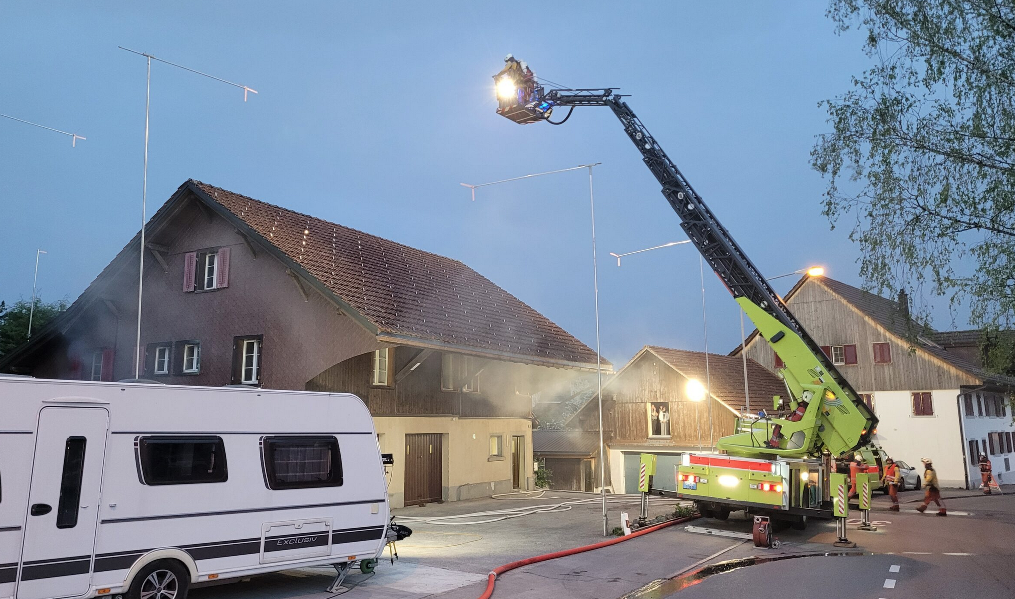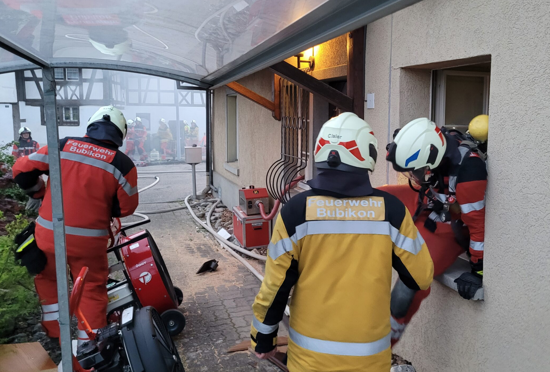 Glücklichereise war das kein Ernstfalleinsatz, sondern eine angekündigte Alarmübung. Das Tanklöschfahrzeug (TLF) erreichte den Zielort als erstes. Sofort wurde mit der Sicherung des Schadenplatzes und mit dem Leitungsbau angefangen. Nach kurzer Zeit waren die ersten Einsatzkräfte bereits im Haus, um nach den vermissten Personen Ausschau zu halten. Für den Verkehr wurde eine Umleitung eingerichtet. «Da fehlte nur noch die Autodrehleiter (ADL) von Hinwil, um die Dachöffnung zu erstellen», schreibt diue Feuerwehr Bubikon. Die ADL hatte aber noch einen echten Einsatz, konnte dann aber auf dem Rückweg doch noch an der Bubiker Übung teilnehmen. Das Dach wurde geöffnet und das Feuer gelöscht.