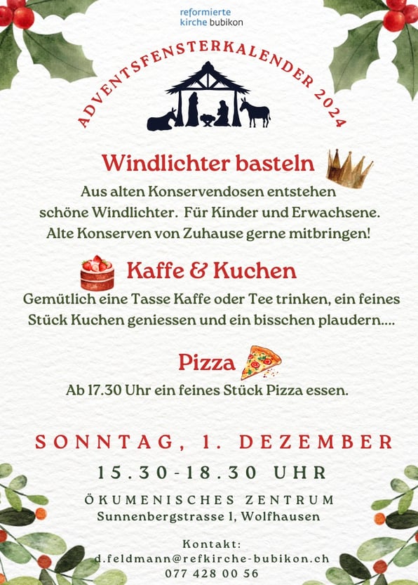 Ab Sonntag, 1. Dezember 2024, werden in Wolfhausen die liebevoll gestalteten Adventsfenster zu leuchten beginnen und zu einem vorweihnächtlichen Abendspaziergang einladen. Bereits beim ersten Fenster (Ökumenisches Zentrum) wartet ein besonderer Event mit Windlichterbasteln und Pizzaessen. Auch bei späteren Stationen gibt es kleine kulinarische Überraschungen. Alle Daten und Orte sind auf den Plänen ersichtlich. (bn)