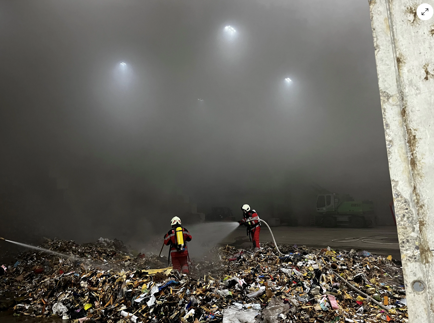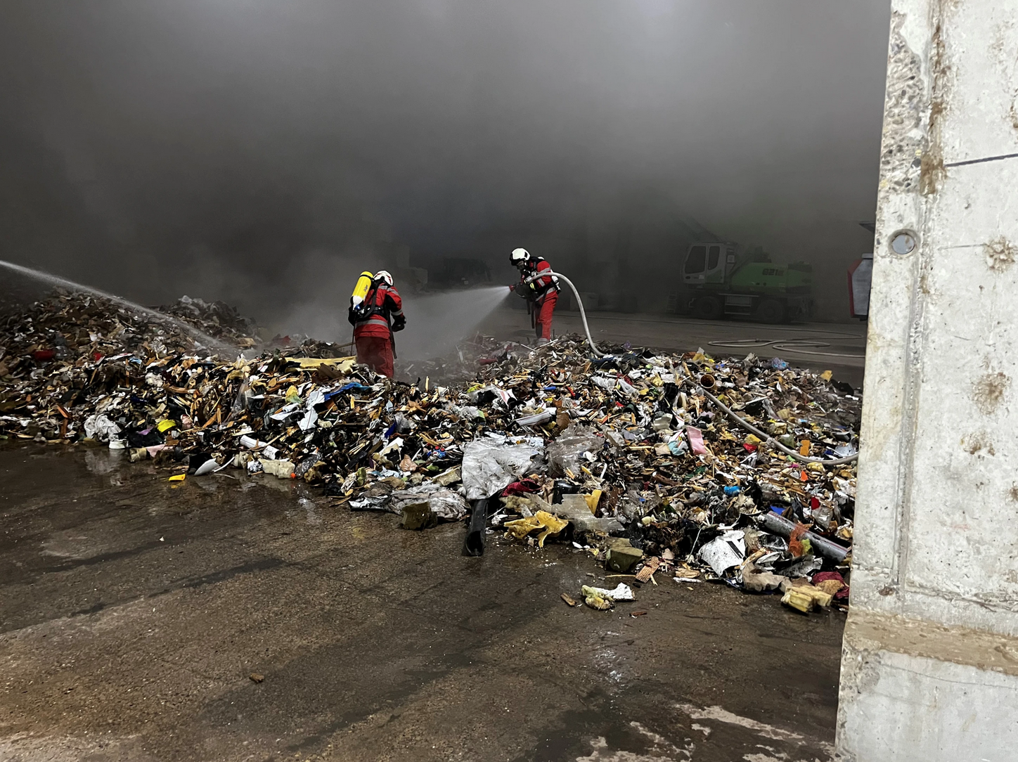 starke Rauchentwicklung in einer Lagerhalle des örtlichen Wertstoff-Centers informiert. Beim Eintreffen der Feuerwehr war die Lagerhalle vollständig mit Rauch