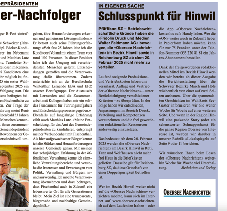 Die «Obersee Nachrichten» aus dem Verlag «Friedolin-Druck und Medien Walter Feldmann AG» werden ab dem 20. Februar 2025 nicht mehr gratis in die Briefkästen von Wolfhausen verteilt. Auch Tann und Rüti müssen auf die Gratiszeitung verzichten, wie Redaktion und Verlag in der Ausgabe vom Donnerstag (13. Februar 2025) schreiben. Begründet wird die Massnahme mit «laufend steigenden Produktions- und Betriebskosten». Ein Jahresabo der gedruckten Zeitung werde für 75 Franken angeboten. (bn)