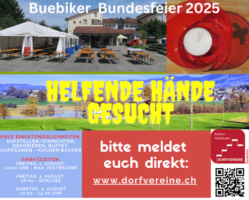 Das Bundesfeierkomitee sucht für die Bubiker Bundesfeier am 1. August 2025 in Wolfhausen helfende Hände: «Wir haben schon einige organisatorische Schritte für die Bundesfeier auf dem Geissbergareal unternommen und nun gibt es ein paar Einsätze, für die wir eure Unterstützung benötigen. Bitte schaut direkt unter dem nachstehenden Link und meldet euch bis zum 28. Juni an», schreibt das Komitee in einer Mail an alle Dorfvereine. Und als Zücherchen: «Den Helfereinsatz versuchen wir – wie im vergangenen Jahr – zu entschädigen.»