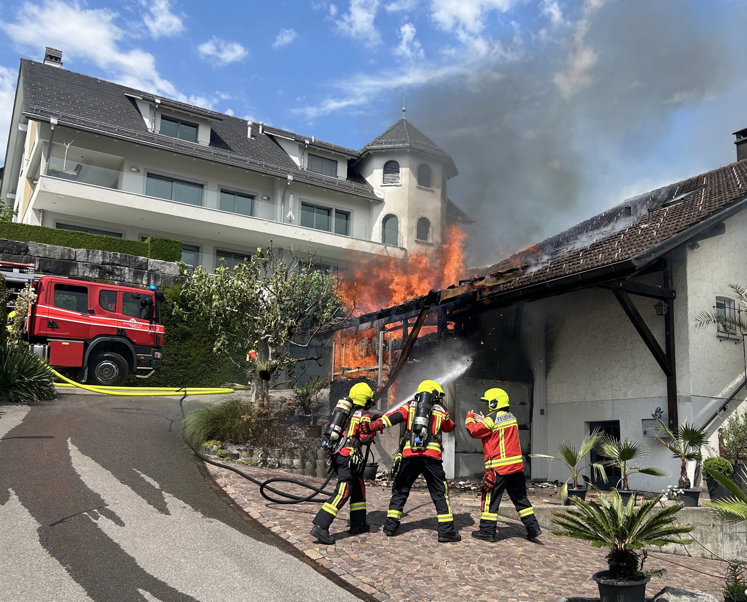 Einsatzkräfte trafen den Schopfanbau neben einem Einfamilienhaus in Vollbrand an. Die Bewohnenden des angrenzenden Wohnhauses konnten ausserhalb des Gefahrenbereichs gebracht