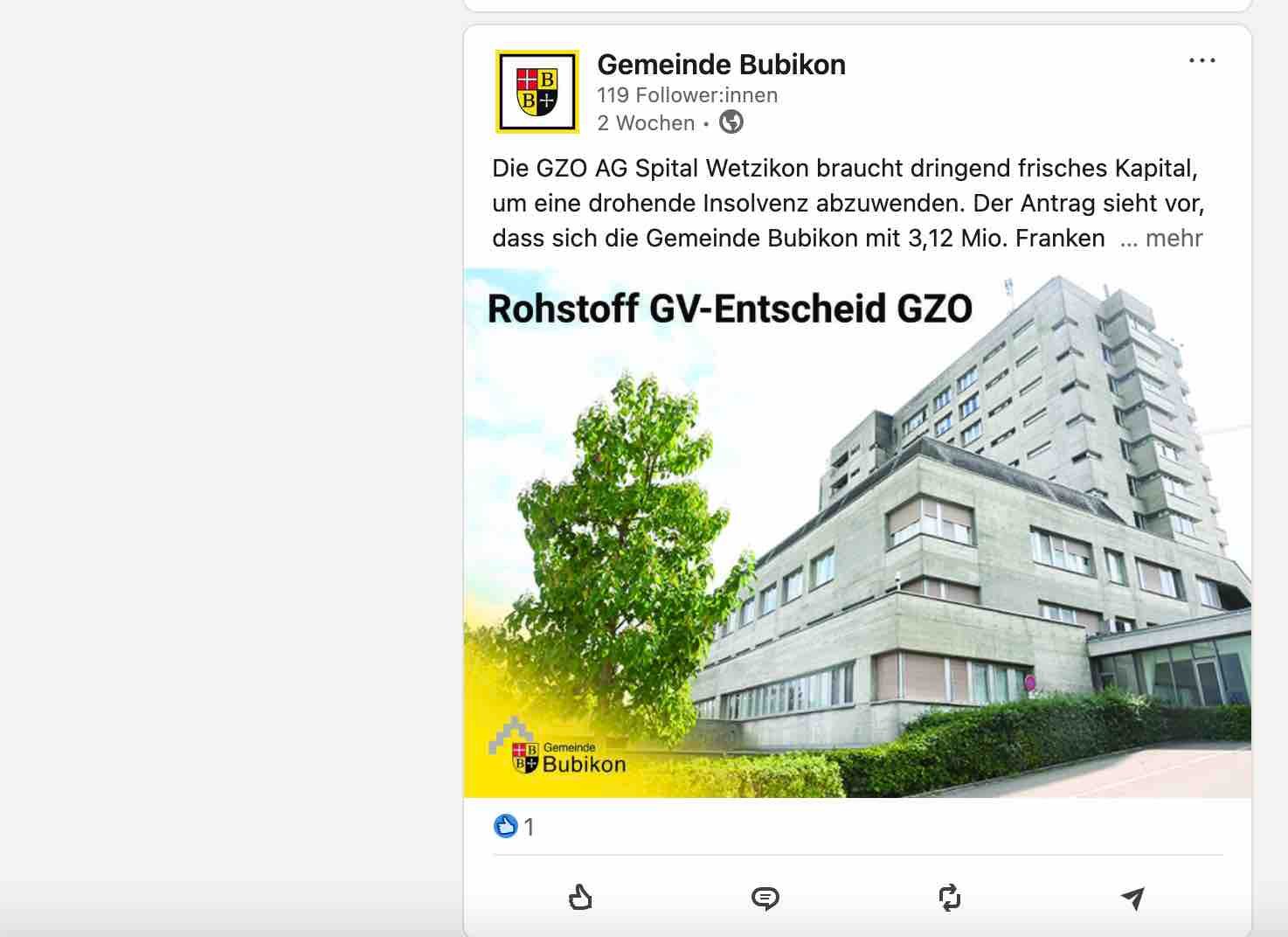 Anders Bubikon: Hier finden sich auch zahlreiche Beiträge politischer Natur, etwa eine ausführliche Abhandlung über das Nein des Gemeinderats zur GZO-Kapitalspritze, eine Präsentation des Siegerprojekts für die Schulraumgestaltung oder eine «frühzeitige Information über Wiederkandidaturen der Gemeindebehörden». Der Account zählt bereits 119 Follower (Stand 22. Juli 2025).