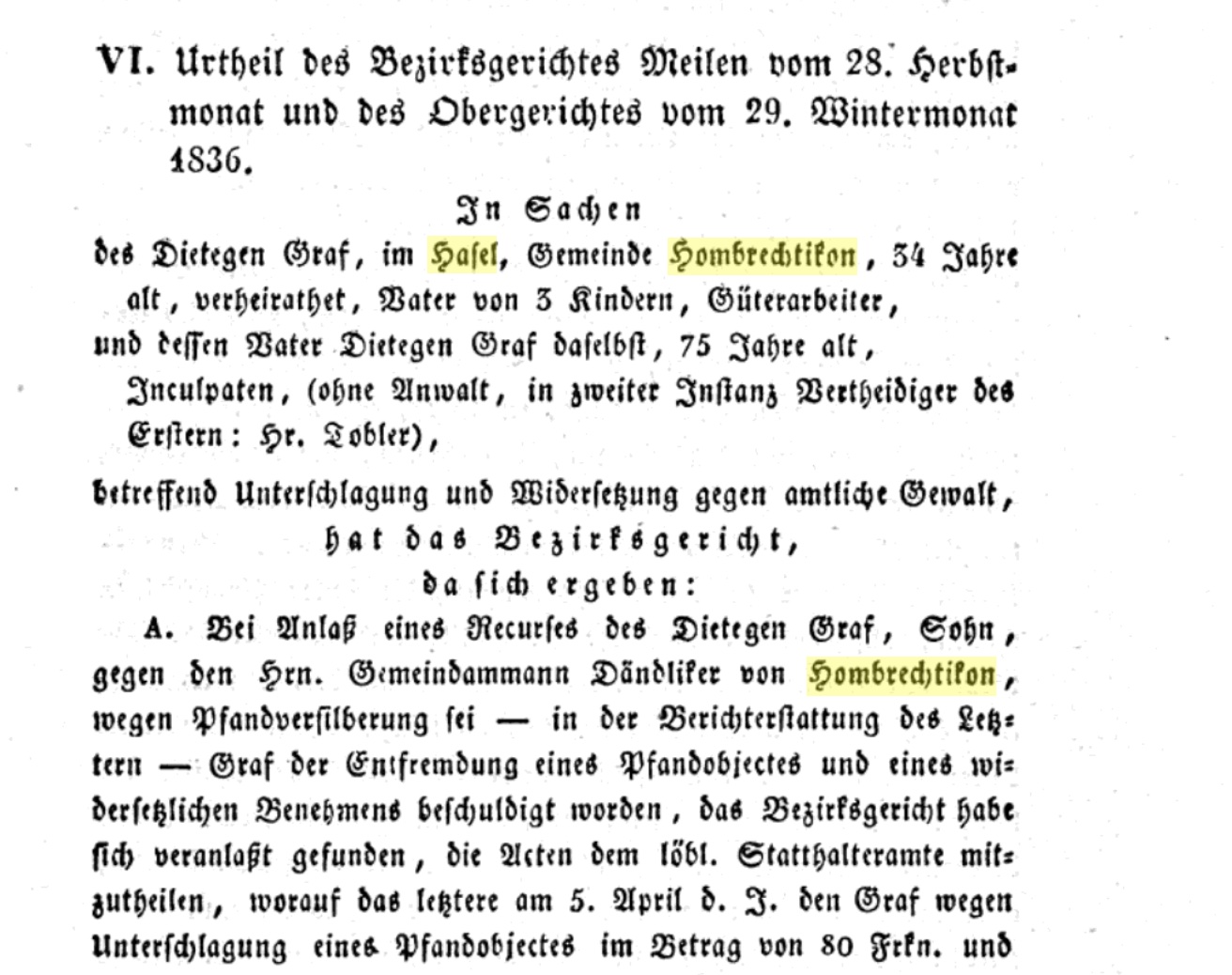 Der Hasel war aber bereits einige Jahre früher, 1836, Schauplatz noch in einem weiteren Gerichtsfall. Damals ging es um eine Auseinandersetzung zwischen einem im Hasel wohnhaften Dietegen Graf  und dem Hombrechtiker Gemeindeammann Dändliker, welcher Graf «Pfandversilberung» beziehungsweise «Entfremdung eines Pfandobjects» vorgeworfen hatte.