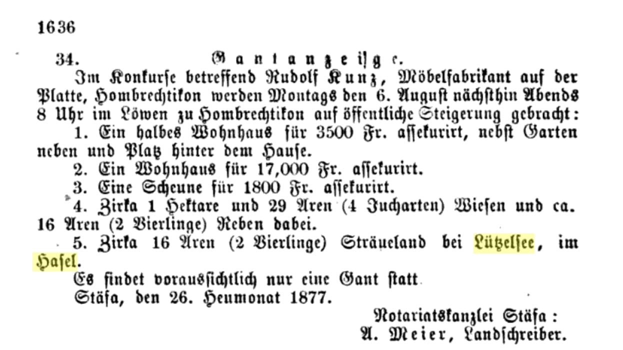 Das Haus dürfte also bereits vor 1873 erstellt worden sein. Schon im Jahre 1877 spielte der Weiler Hasel im Konkus gegen den Hombrechtiker Möbelfabrikanten Rudolf Kunz, wohnhaft auf der Platte, eine Rolle. Am 8. August 1877 fand nämlich im Hombrechtiker «Löwen» eine öffentliche Versteigerung des Liegenschaftenbesitzes von Rudolf Kunz statt, wozu auch rund 16 Aren «Sträueland» im Hasel am Lützelsee gehörten. Der vermutlich aufsehenerregende Konkursfall wurde erst 1878 abgeschlossen; Kunz entging damals der Einstellung im Aktivbürgerrecht.