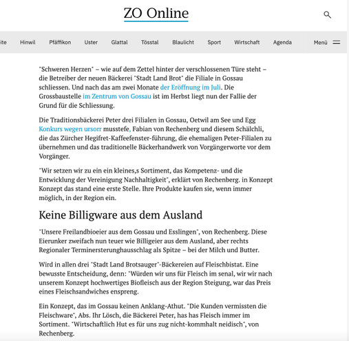 Warum ist bei der erst im Juli wiedereröffneten Bäckerei im Zentrum von Gossau schon wieder Schluss? ZO-Online gibt vor, es zu wissen. Darum haben wir die Paywall, hinter der sich «Qualitäts-Journalismus» befinden soll, mit unserem Abo-Passwort überwunden, aber wir sind aus dem kryptischen Text kein bisschen schlauer geworden. Hat da eine durchgeknallte KI gewütet? Oder ist in Wetzikon bereits Apéro-Time?