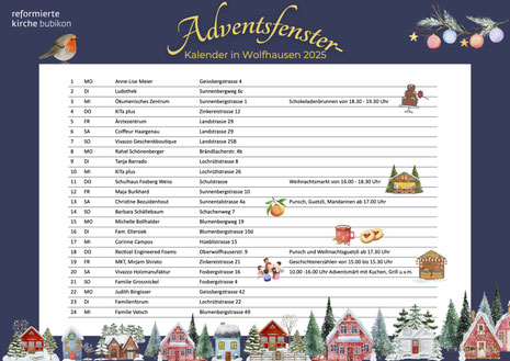 Der Weg bis zum Heiligen Abend, 24. Dezember, ist ein schöner Abendspaziergang durch unser winterliches Dorf. An manchen Tagen warten zudem spezielle Überraschungen auf die Besucherinnen und Besucher: Am 3. Dezember beim Ökumenischen Zentrum ein Schokoladebrunnen, am 11. Dezember beim Schulhaus Fosberg weiss ein Spezialfenster im Rahmen des Schul-Weihnachtsmarktes. Am 13. Dezember gibt es Punsch, Guetzli und Mandarinen an der Sunnentalstrasse 4A, am 18. Dezember Punsch und Weihnachtsguetzli an der Oberwolfhauserstrasse 9. Am 19. Dezember werden an der Zinkereistrasse 21 Geschichten erzählt, und am 20. Dezember öffnet sich das Fenster mit Grill und Kuchen am Vivazzo-Adentsmärt an der Fosbergstrasse 16. (bn)