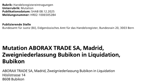 Mit Urteil vom 01. Dezember 2025 hat das Konkursgericht des Bezirksgerichts Hinwil mit Wirkung ab dem 01. Dezember 2025 über die bereits aufgelöste ausländische Zweigniederlassung der ABORAX TRADE SA, Bubikon, den Konkurs eröffnet. Das Konkursverfahren wurde mit Urteil desselben Gerichts vom 01. Dezember 2025 mangels Aktiven gleich wieder eingestellt. Dies geht aus einer Publikation im Schweizerischen Handelsamtsblatt vom Montag (8. Dezember 2025) hervor.