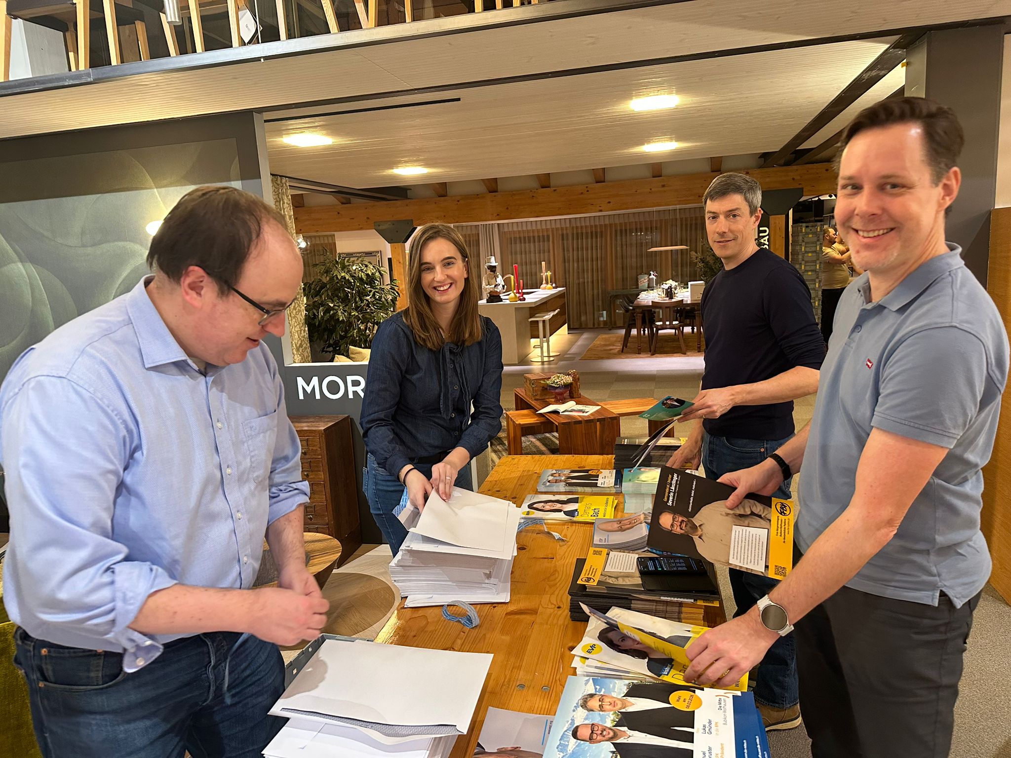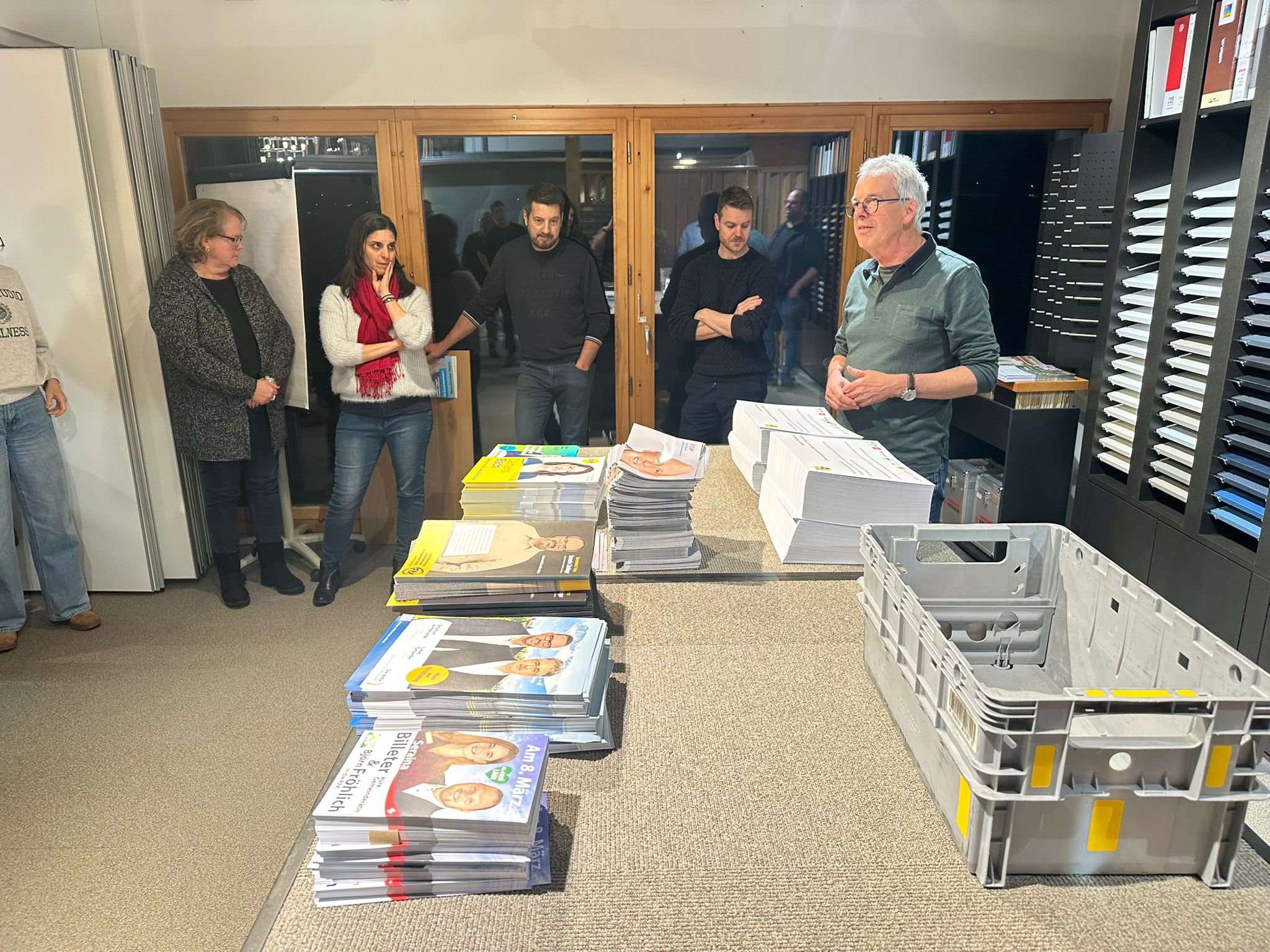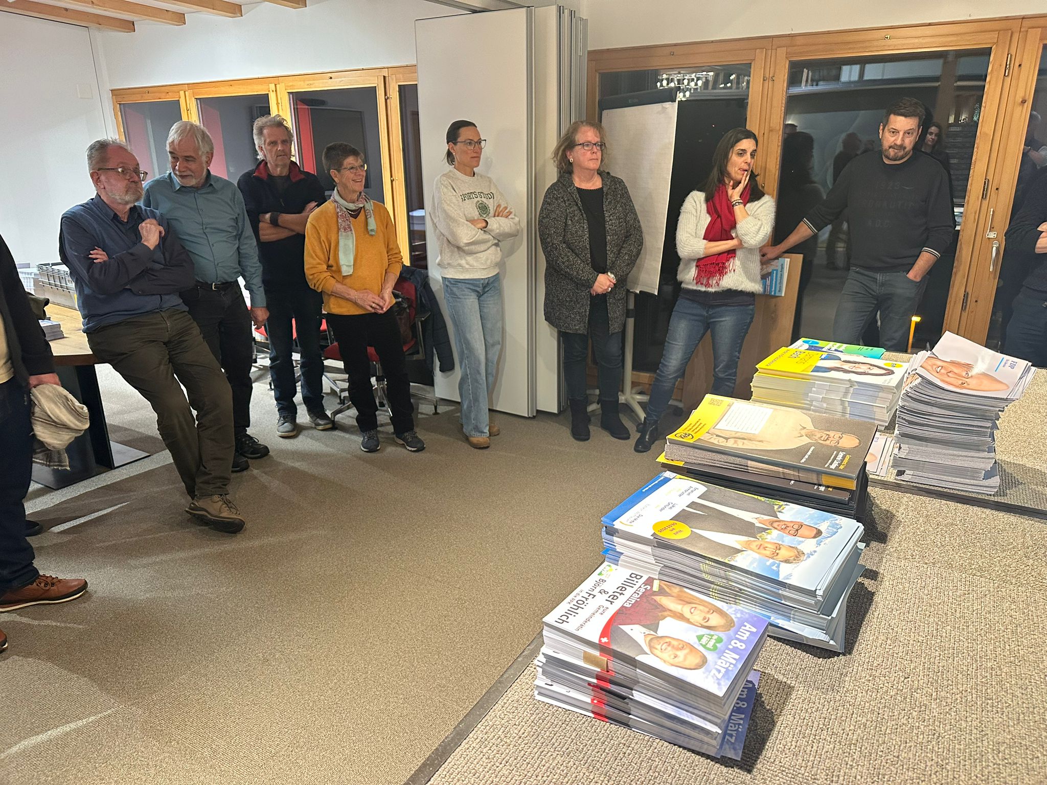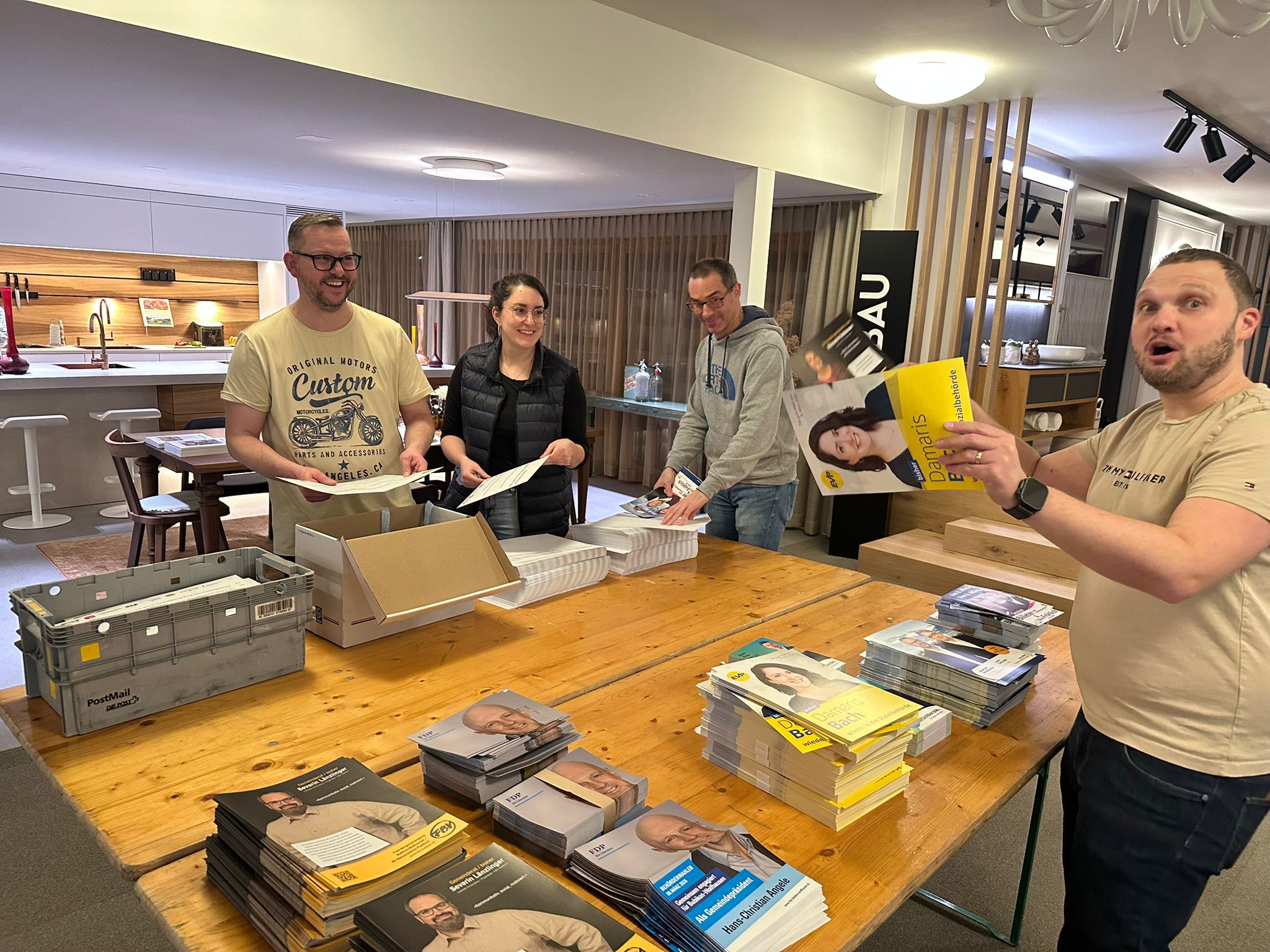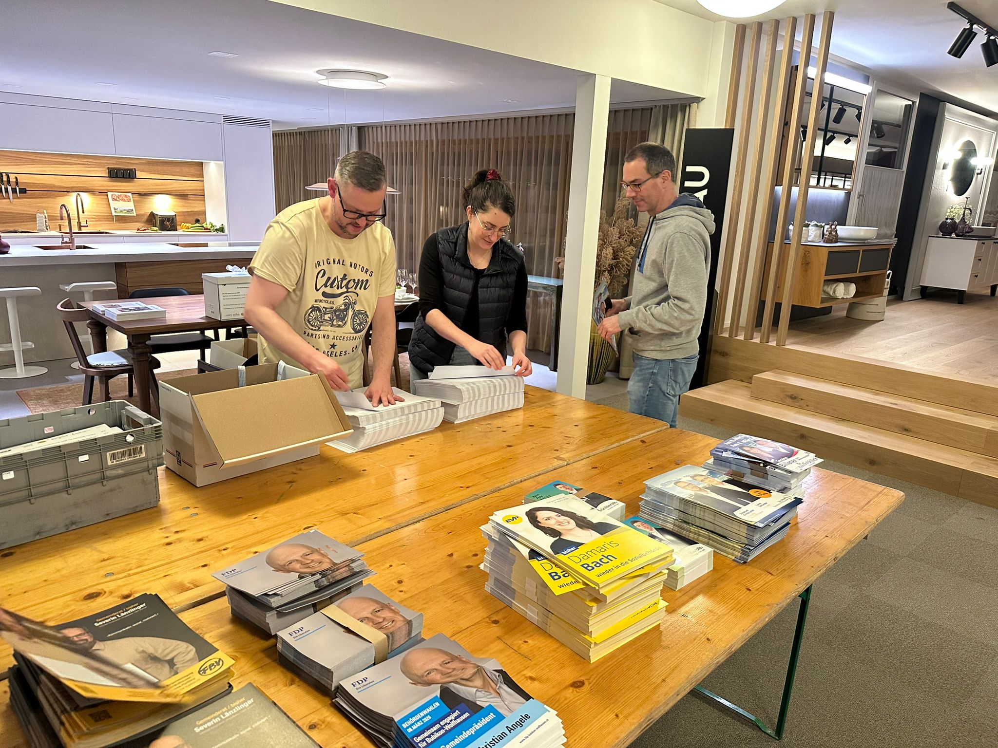 Rund zwei Dutzend Kandidatinnen und Kandidaten, Mitglieder der Parteipräsidien und weitere Helferinnen und Helfer haben am Montagabend (26. Januar 2026) in Bubikon Flyer für den gemeinsamen Versand der Bubiker Ortsparteien im Hinblick auf die Behördenwahlen vom 8. März 2026 verpackt. Auch drei Gemeinderäte – Severin Länzlinger, Reto Frey und Seraina Billeter – legten persönlich Hand an.