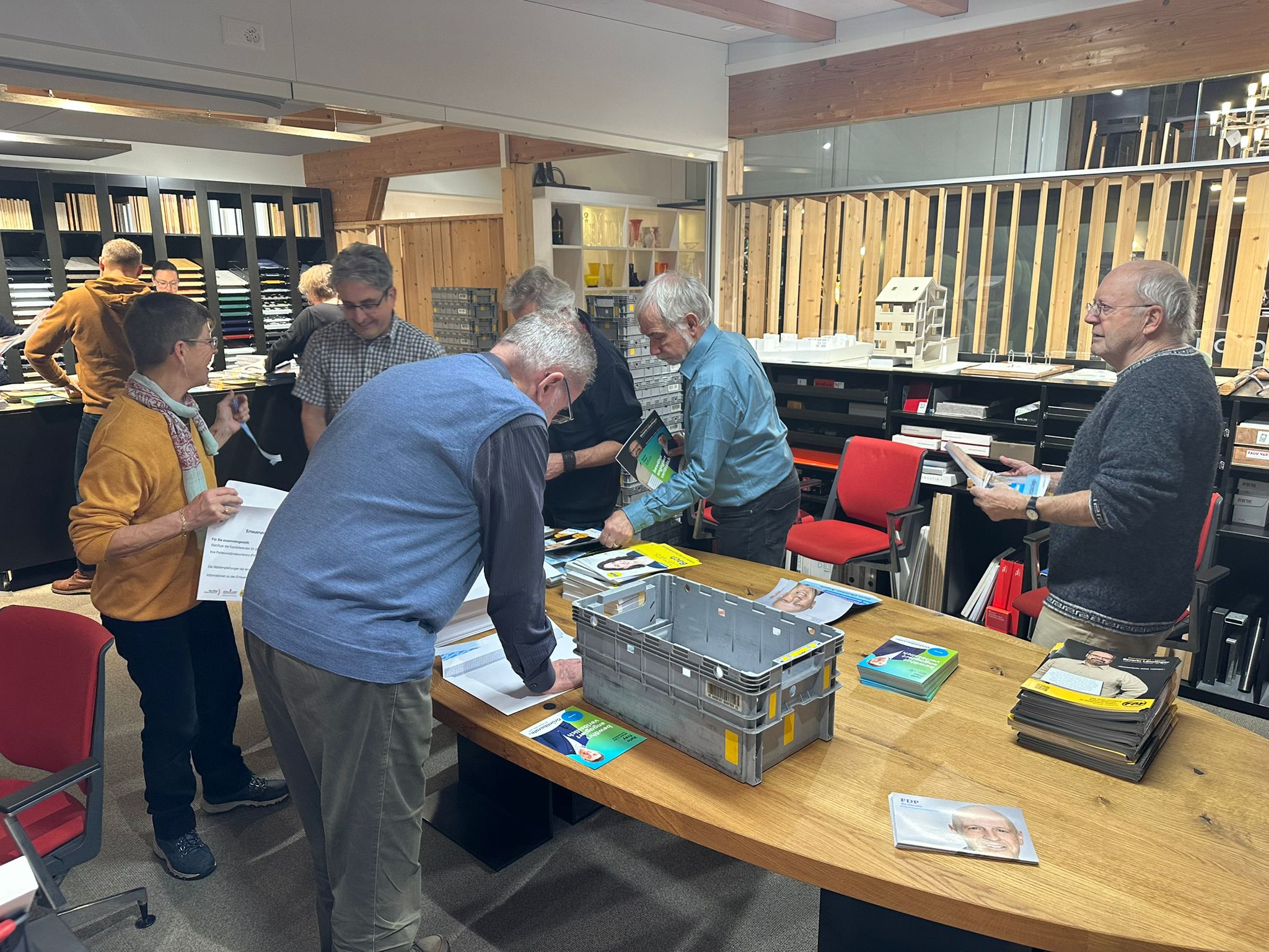 Obschon eine ganze Menge Hochglanzpapier zu verarbeiten war, ging die Aktion in der Räumlichkeiten der Firma Bertschinger zügig und bei guter Stimmung vonstatten. Nicht auszuschliessen, dass da bereits politische Koalitionen geschlossen wurden... (bn)